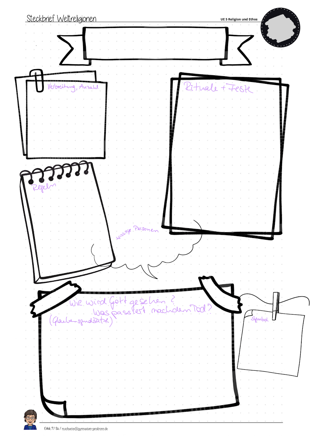 In der Klassenstufe 7 hatte ich insgesamt 38 kopierte A4-Seiten, also 19 Blätter, dazu noch vier Tests und Rückmeldebögen. Im Vorjahr waren es ca. 50 Seiten, also 25 Blätter. Ich habe bei jeder Kopie überlegt, ob sie notwendig ist oder nicht – und auch gegenüber dem vorherigen Schuljahr einiges an Texten weg gelassen bzw. zusammengefasst. Optimierungsmöglichkeiten gäbe es noch bei Tabellen oder Vorlagen. Ich habe beispielsweise einen Religionssteckbrief (siehe Abbildung), den wir über alle 5 Weltreligionen ausfüllen – und natürlich drucke ich den dann auch 5x für jede*n aus.