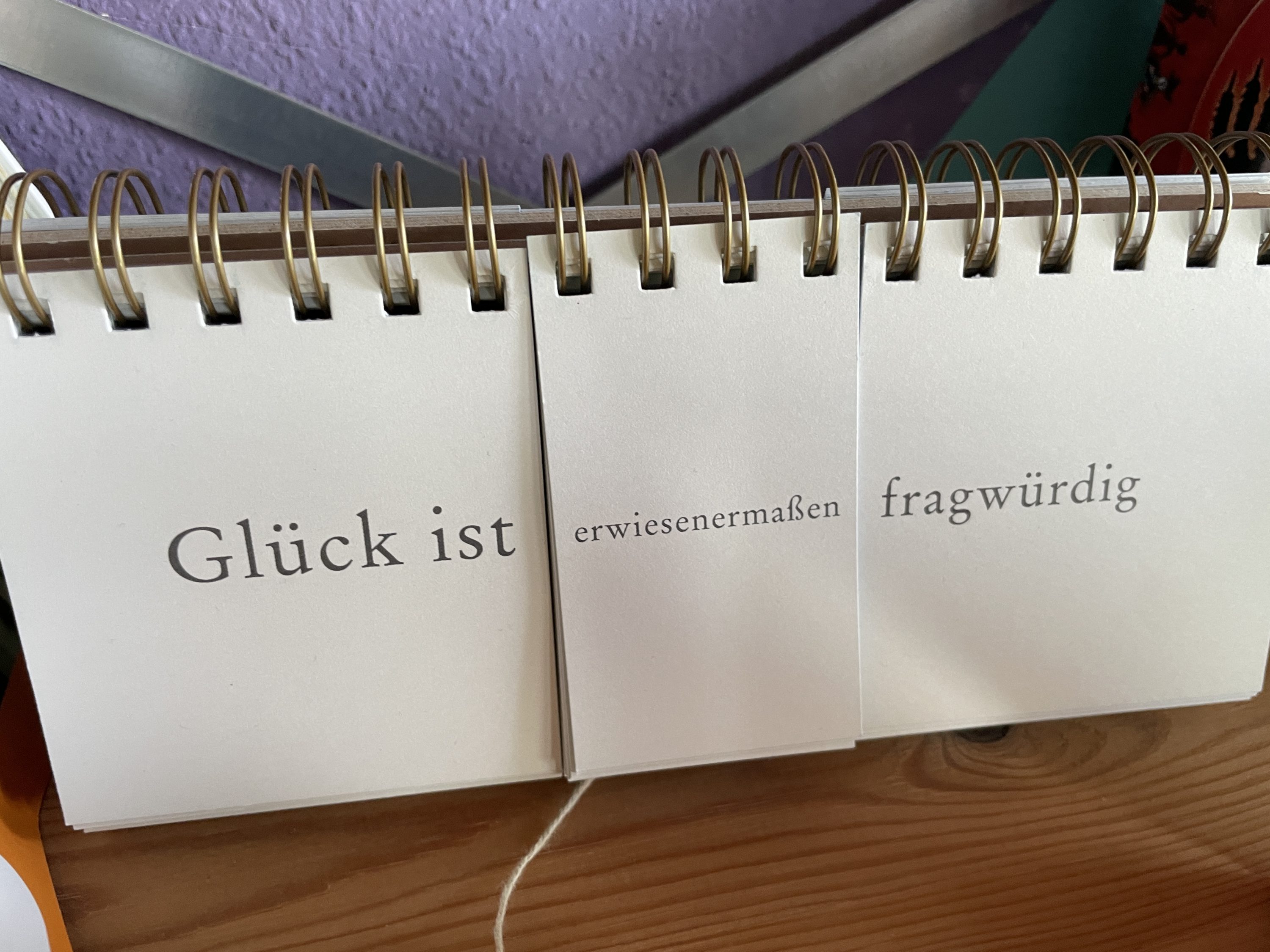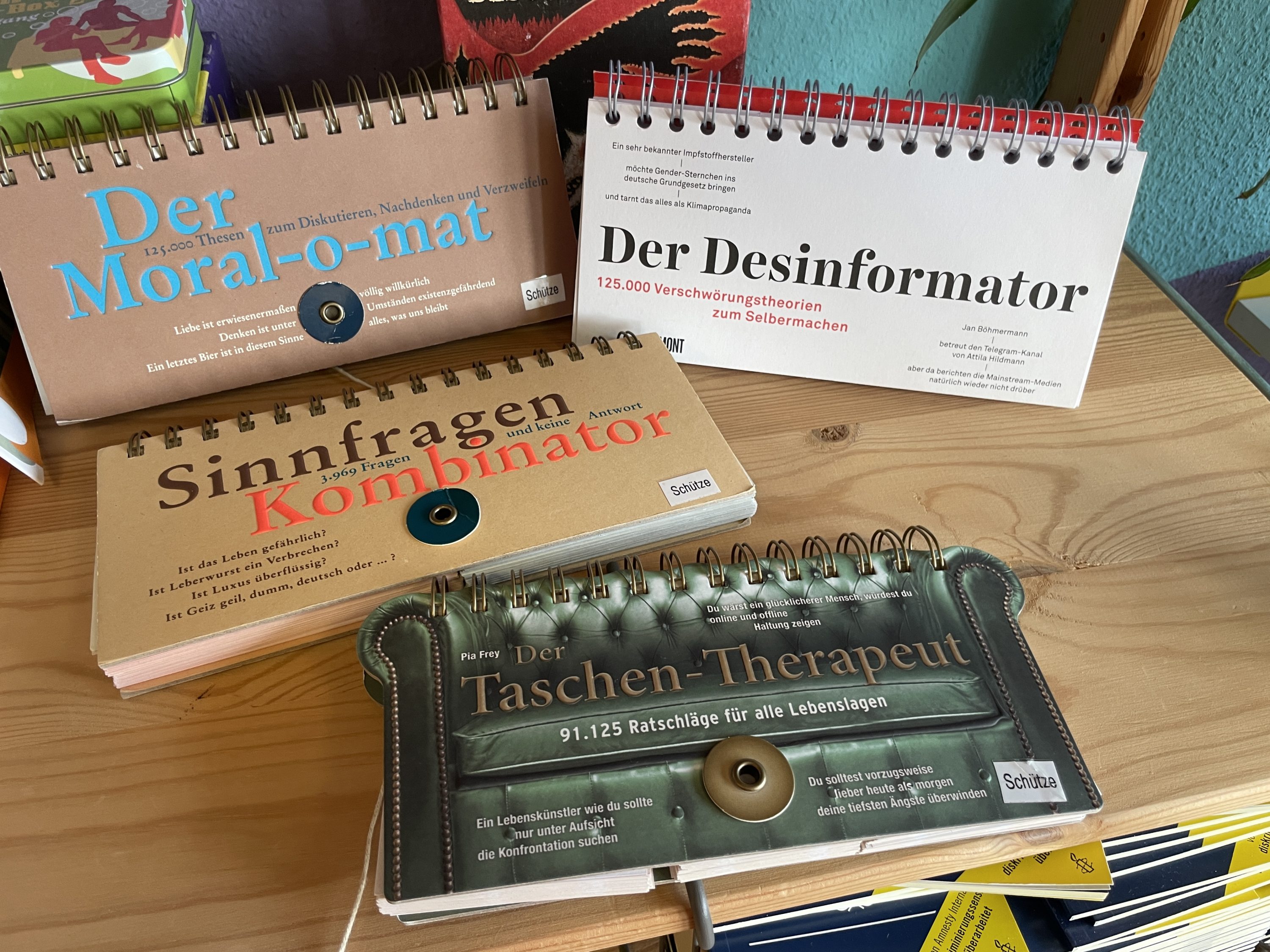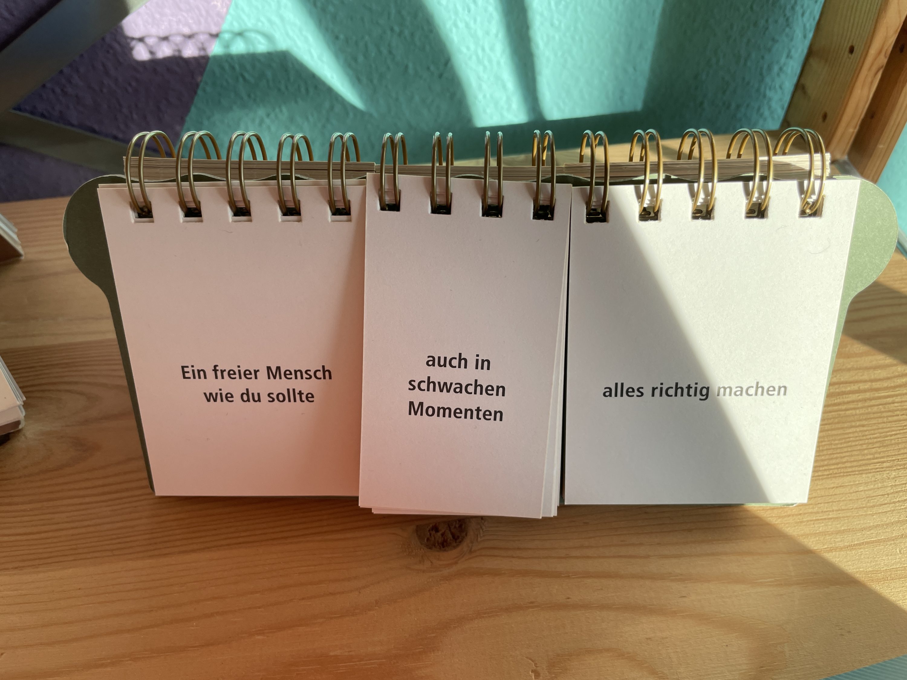 Inspiration. Ich habe vier verschiedene Umblätter-Spiele (wie ist der korrekte Name dafür?), die von unterschiedlichen Schüler*innen neu geblättert werden. Durch die vielen verschiedenen Möglichkeiten gibt es eine Art offenen Dialog – und immer auch einen kleinen Einblick, welche Fragen/Themen gerade aktuell sind. Außerdem suche ich für jedes Jahr einen schönen Wochenkalender mit Sprüchen oder Fragen. Diese kaufe ich immer erst Anfang Januar, wenn Kalender schon reduziert sind. Meist findet sich trotzdem ein passender. Außerdem habe ich verschiedene philosophische Fragen-Karten und Zitate-Kartenspiele im Regal. Wenn jemand ein Essay-Thema sucht, gebe ich eine Zufalls-Karte raus.