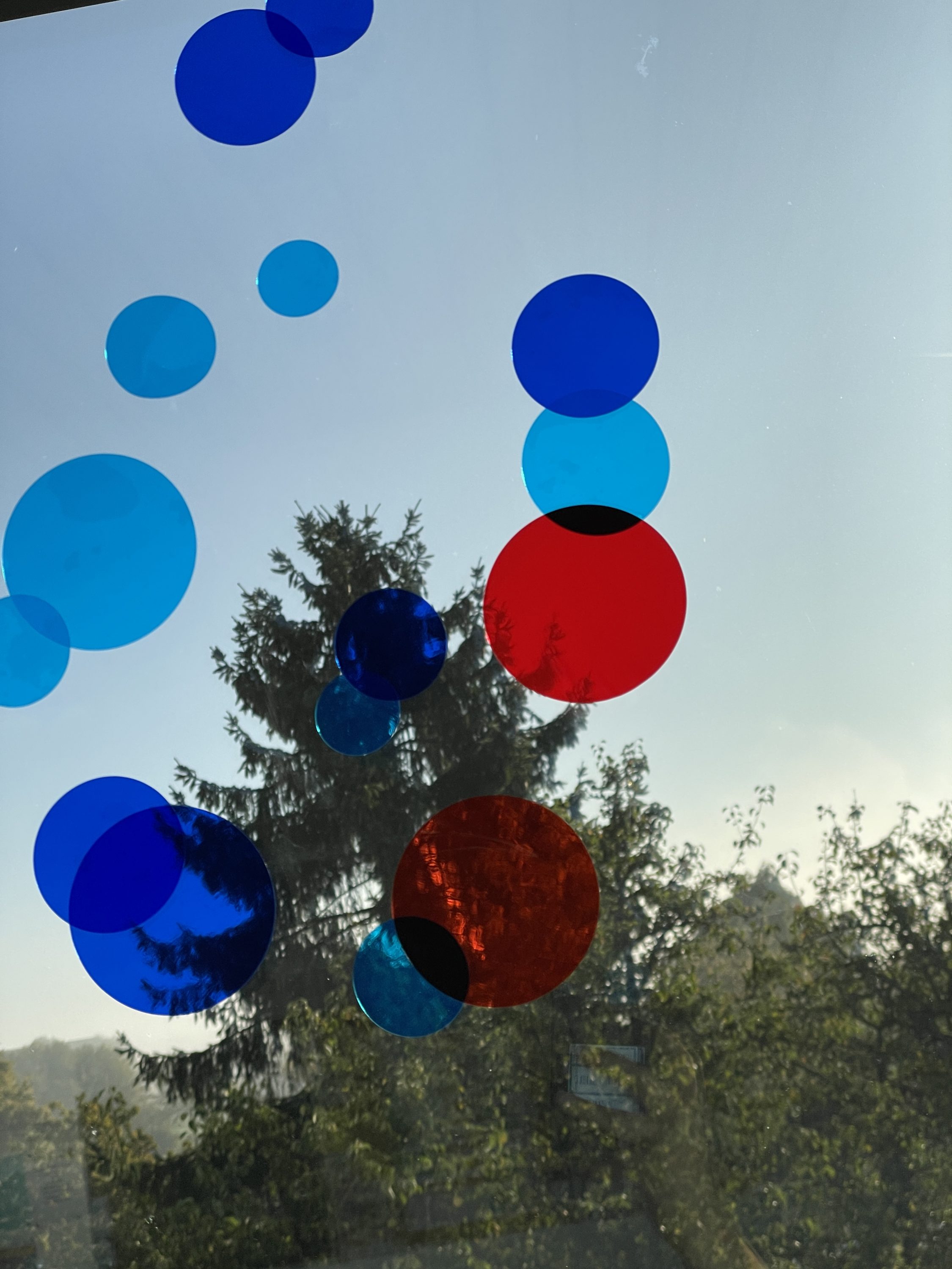 Punkte. Ich liebe Punkte. Diese Punkte am Fenster geben einerseits den Vögeln das Signal, dass es sich um eine Glasscheibe handelt. Vorher hatte ich öfter mal welche, die dagegen gekracht sind. Andererseits zaubern sie ein tolles Licht und Muster in den Raum.