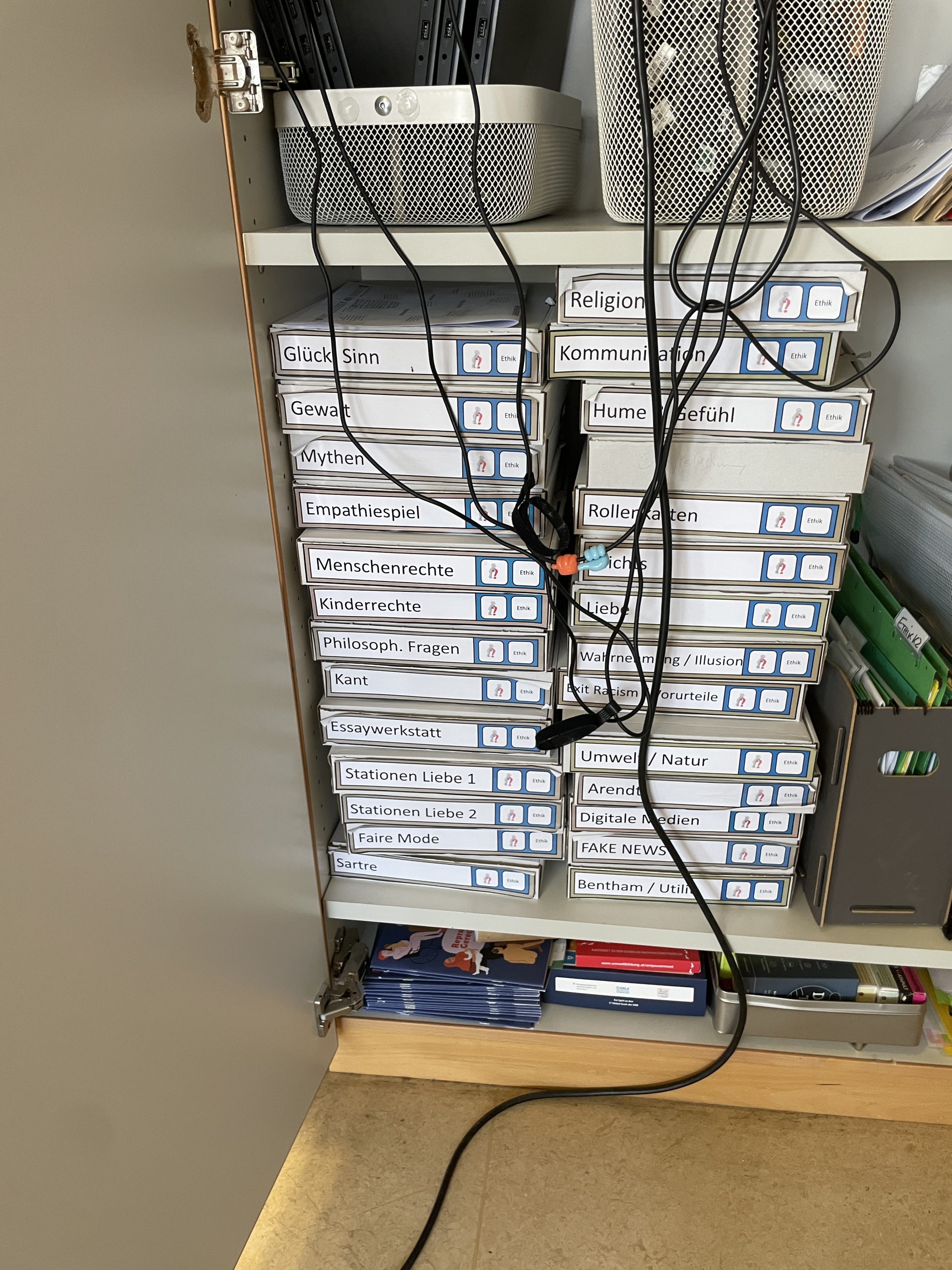 Zeitschriften. Ich habe zu Hause u.a. ein Abo des Philosophie Magazines (früher auch Hohe Luft), die Hefte stelle ich aber in die Schule ins Regal (digital ist es auf meinem Ipad). Gut, um mal rein zu schauen und auch um ein Vortrags-Thema (GFS) zu finden. Auch meine Abohefte des Katapult-Magazins sowie des Atmo-Magazins finden ihren Weg ins Regal des Ethikraums. Die Plakate des Katapult-Knickers eignen sich oft sehr gut um sie im Raum aufzuhängen.